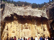 Located twelve kilometers south of Luoyang, the Longmen Grottoes are among the greatest treasure troves of ancient stone carving in China, together with Dunhuang in the northwestern province of Gansu and Yungang in the northern province of Shanxi. The work on these grottoes began in 494 during the Northern Wei Dynasty and continued for more than four hundred years in te ensuing Sui and Tang dynasties. The grottoes are cut into precipitous cliffs on both banks of the Yishui River, and stretch for over a thousand metres from south to north. The existing 2,100caves and niches contain more than 100,000 statues of Buddhist figures in various postures, the largest rising over seventeen metres and the smallest only two centimeters. There are also 3,600 inscribed tablets and forty pagodas here. The stone sculptures at Longmen represent a new height in the art of stone carving and the development of Buddhism in China. The largest Buddhist monastery at Longmen, the Fengxian Temple, in particular, contains the most exquisite works of art among the grottoes and represents the best stone carving techniques of the Tang Dynasty. It was built partly with the funds that Tang Dynasty Emperor Gao Zong(r.650-683) gave to his wife, Empress Wu Zetian for cosmetics.